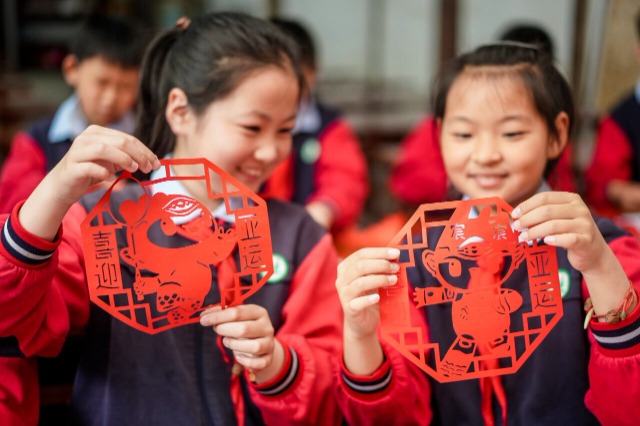學(xué)生展示與亞運(yùn)相關(guān)的剪紙作品
