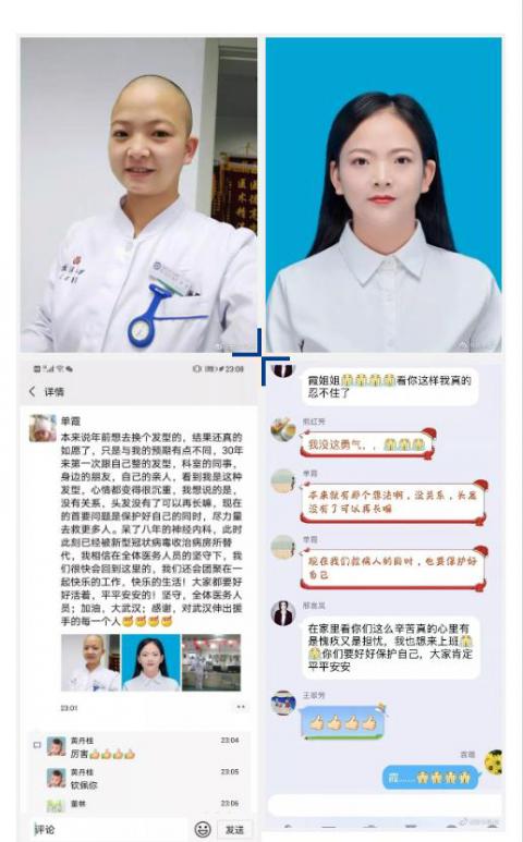為了避免交叉感染,節(jié)約穿脫防護(hù)衣帽的時(shí)間,兩個(gè)孩子的母親、人民醫(yī)院護(hù)士單霞毅然剪掉了自己的長(zhǎng)發(fā)。“用我及腰長(zhǎng)發(fā),換你健康平安”。