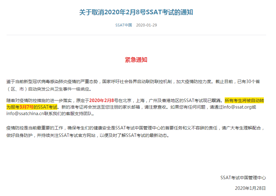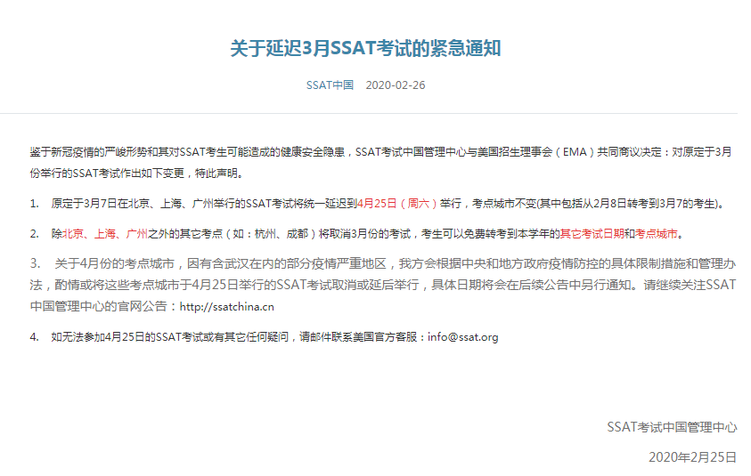 1)原定于3月7日在北京、上海、廣州舉行的SSAT考試將統(tǒng)一延遲到4月25日(周六)舉行,考點(diǎn)城市不變(其中包括從2月8日轉(zhuǎn)考到3月7的考生)。