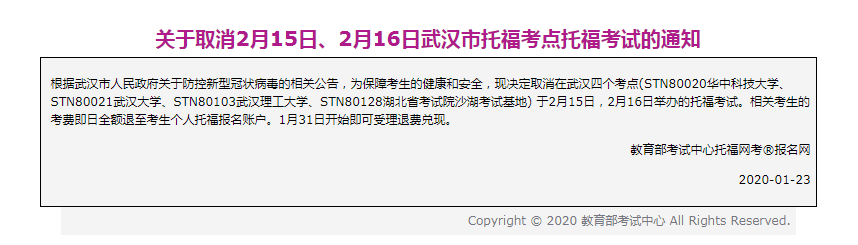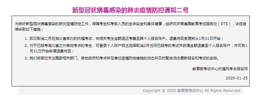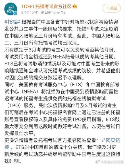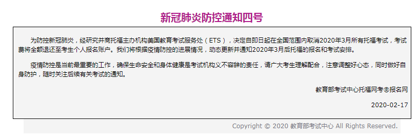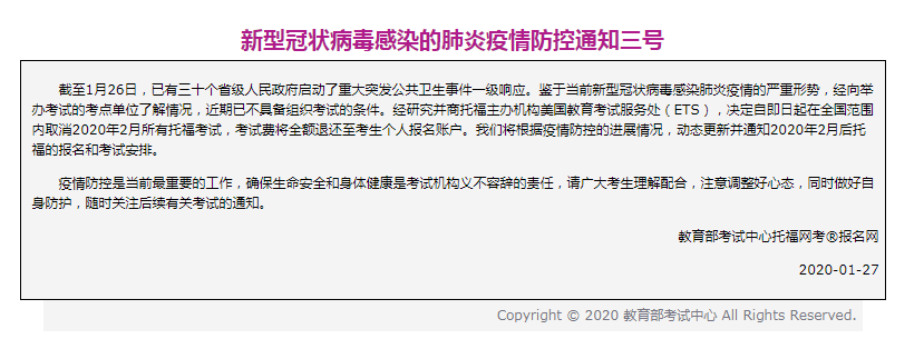 根據(jù)當(dāng)前中國各省市針對新型冠狀病毒疫情突發(fā)公共衛(wèi)生事件一級響應(yīng)的要求,托福?考試決定取消在中國大陸地區(qū)三月份所有考試。至此,中國大陸地區(qū)二、三月份所有托福考試均已取消。