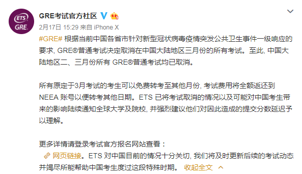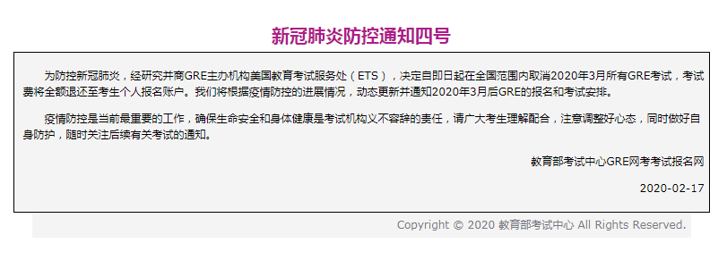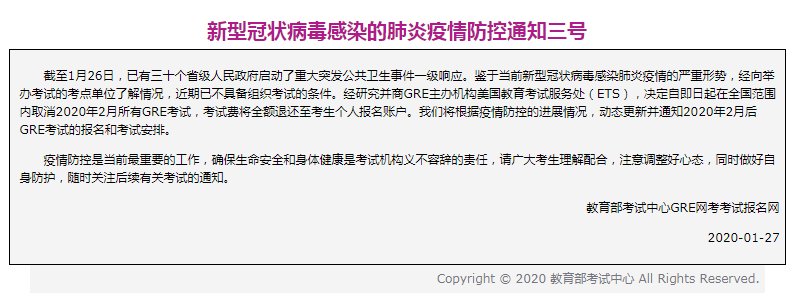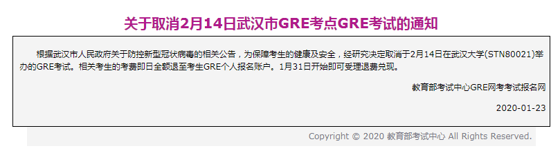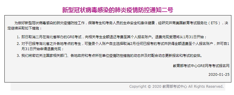 根據(jù)當(dāng)前中國各省市針對新型冠狀病毒疫情突發(fā)公共衛(wèi)生事件一級響應(yīng)的要求, GRE?普通考試決定取消在中國大陸地區(qū)三月份的所有考試。至此, 中國大陸地區(qū)二、三月份所有 GRE?普通考試均已取消。
