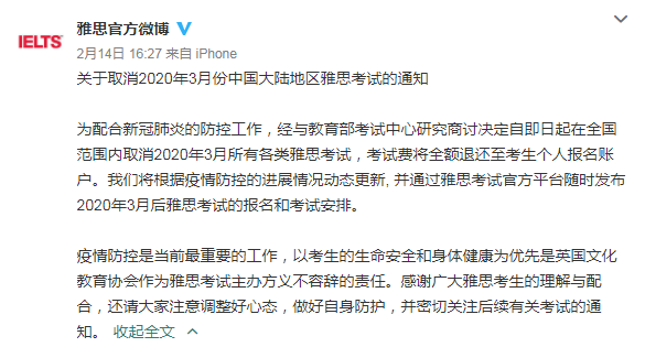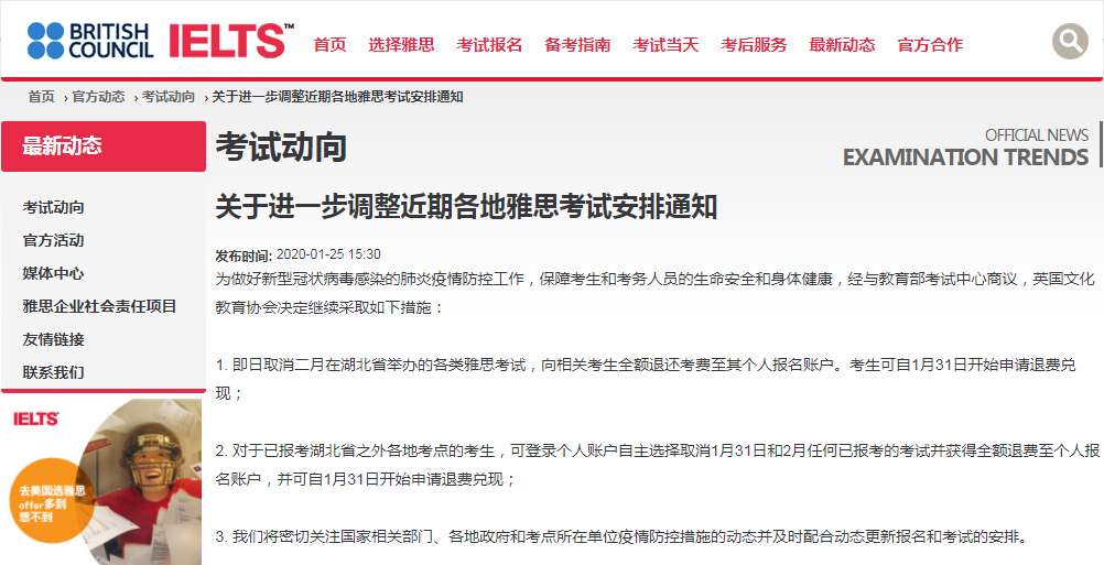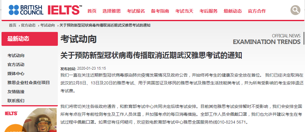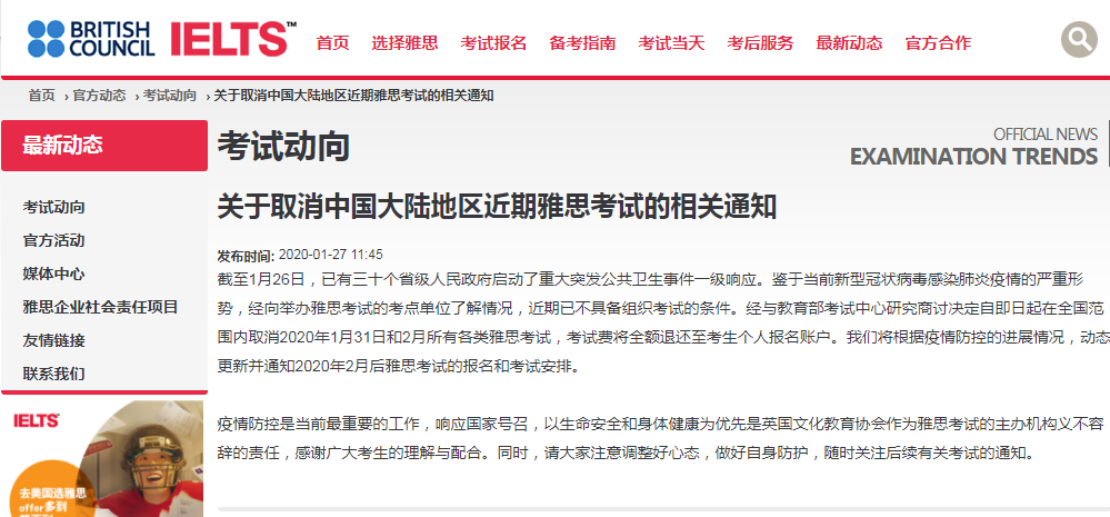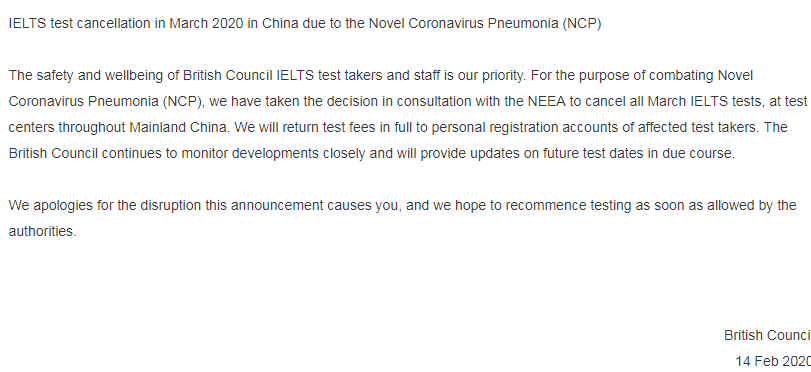 雅思官方:取消3月份中國大陸地區(qū)雅思考試