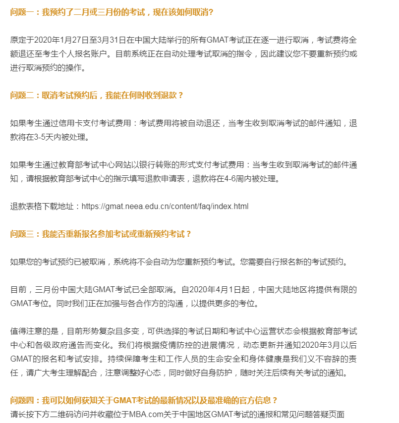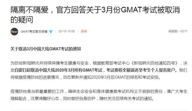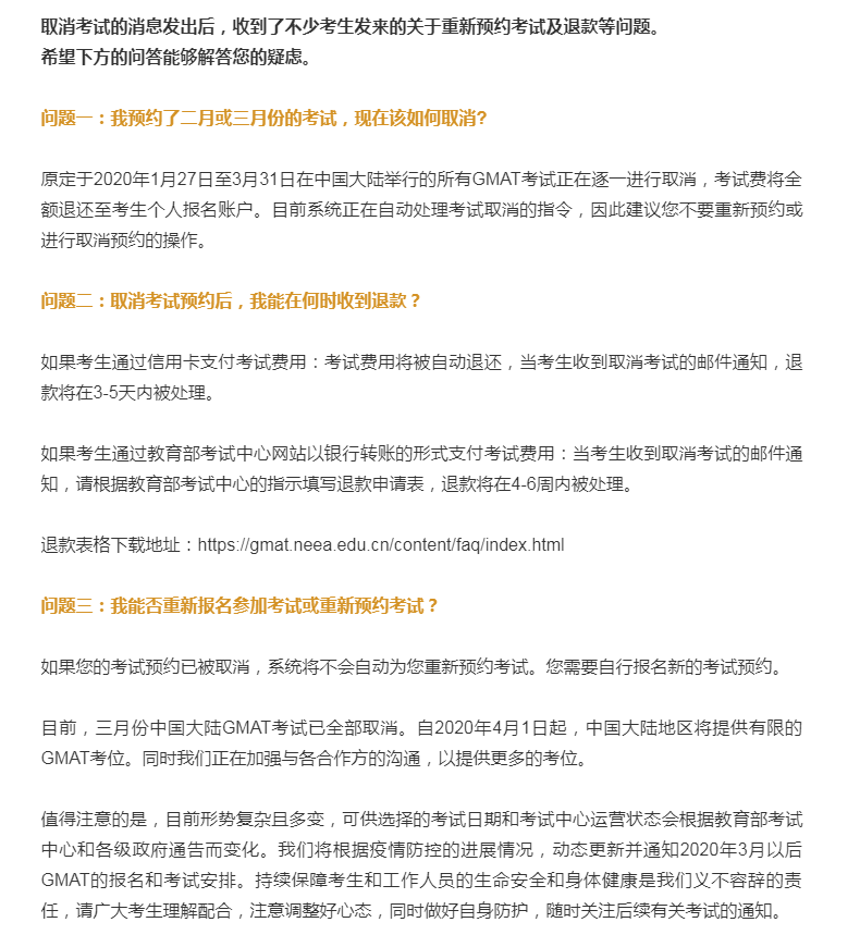 為防控新冠肺炎并持續(xù)保障考生健康與安全,根據(jù)教育部考試中心《新冠肺炎防控通知四號》,決定自即日起取消中國大陸2020年3月所有GMAT考試,考試費(fèi)將全額退還至考生個人報名賬戶。