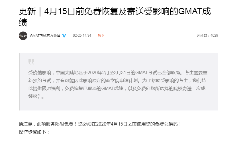 1) 4月15日前免費(fèi)恢復(fù)及寄送受影響的GMAT成績(請注意,此項(xiàng)服務(wù)限時免費(fèi)!您必須在2020年4月15日之前使用您的免費(fèi)兌換碼!)