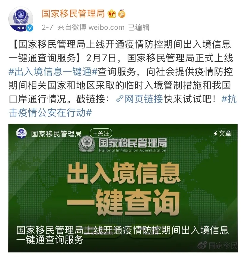 此后國家移民管理局將不再已列表形式發(fā)布入境管理措施,大家可以自行查閱“出入境信息一鍵通”。