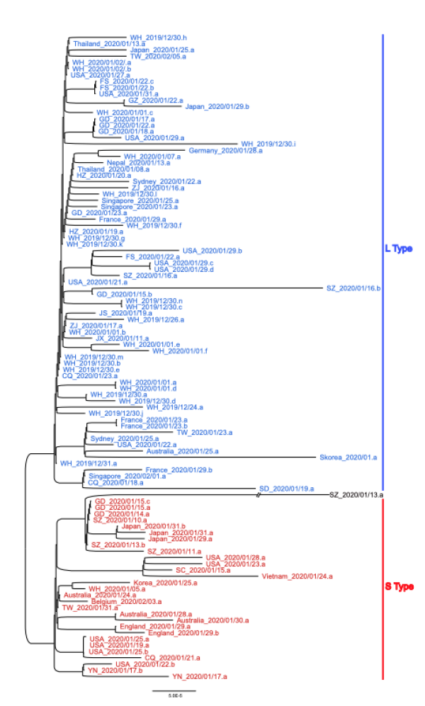 論文稱,兩個亞型的區(qū)別在于病毒RNA基因組的第28144位點,L亞型是T堿基(對應(yīng)亮氨酸,Leu),S亞型是C堿基(對應(yīng)絲氨酸,Ser)。通過與其他冠狀病毒比較,作者發(fā)現(xiàn)S型新冠病毒與蝙蝠來源的冠狀病毒在進化樹上更接近,從而得出S型相對更古老的結(jié)論。
