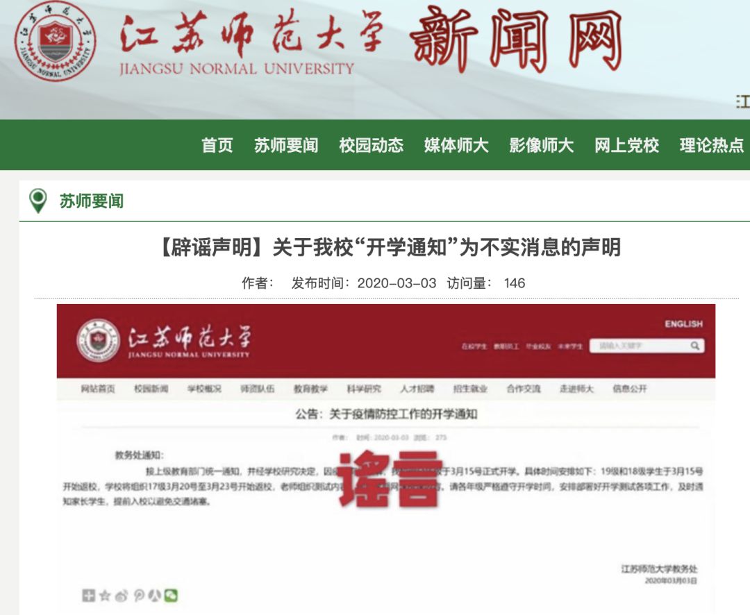 3月3日,江蘇師范大學(xué)新聞網(wǎng)發(fā)布辟謠聲明,3月3日中午,我校發(fā)現(xiàn)部分網(wǎng)絡(luò)和自媒體平臺(tái)上傳播的“公告:關(guān)于疫情防控工作的開學(xué)通知”為人為PS形成,我校未發(fā)布過(guò)此類信息。