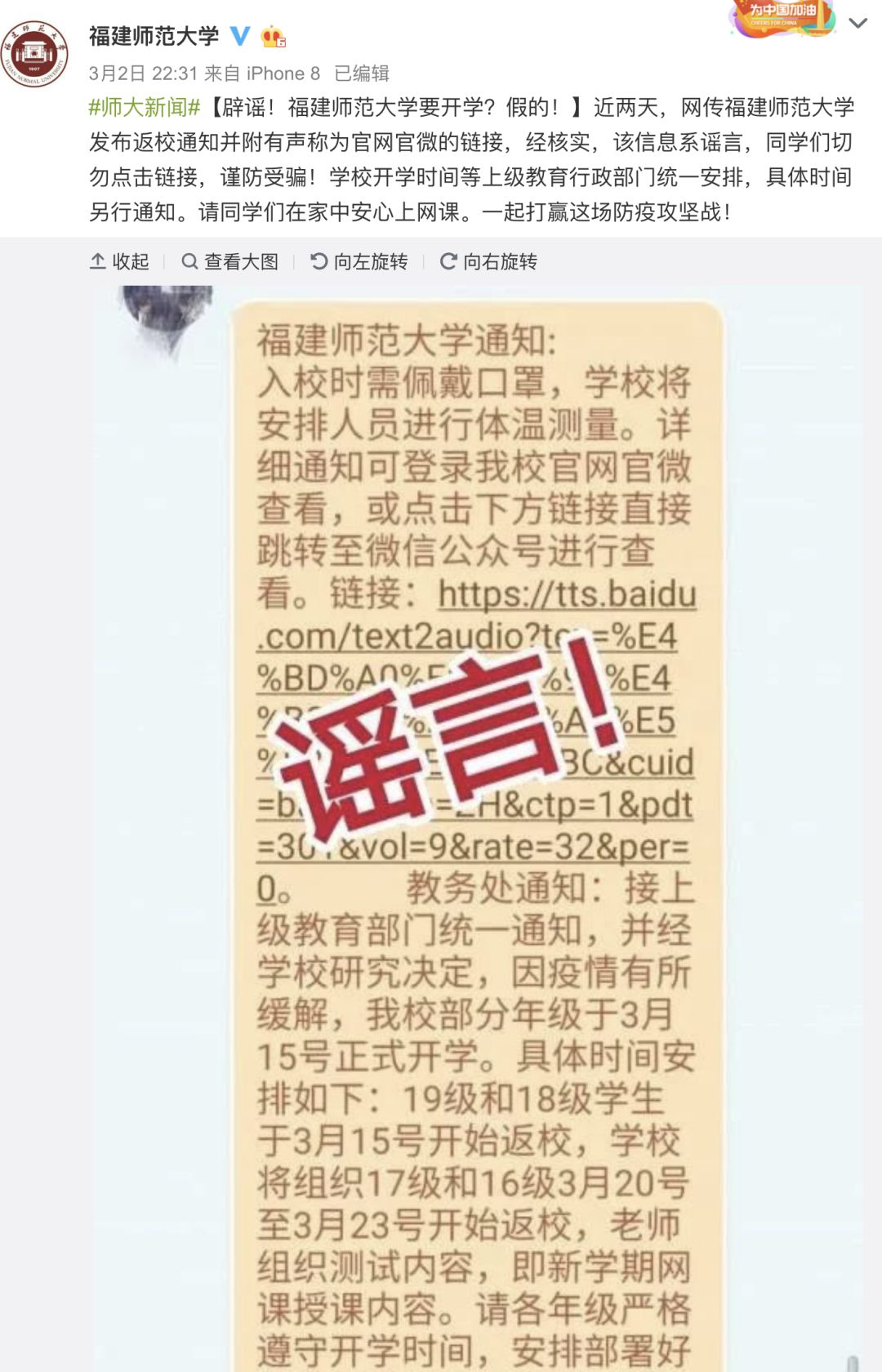 3月3日,山西農(nóng)業(yè)大學(xué)新聞網(wǎng)發(fā)布辟謠稱,在微信圈中發(fā)現(xiàn)轉(zhuǎn)發(fā)《山西農(nóng)業(yè)大學(xué)通知》有關(guān)“我校部分年級(jí)于3月15號(hào)正式開學(xué)”等截圖信息,均屬與事實(shí)不符的虛假消息。望廣大師生不制謠、不信謠、不傳謠。學(xué)校正式開學(xué)和返校時(shí)間將通過(guò)校園網(wǎng)、官方微信等正式渠道發(fā)布相關(guān)信息,未接到學(xué)校正式通知,務(wù)必不要返校。