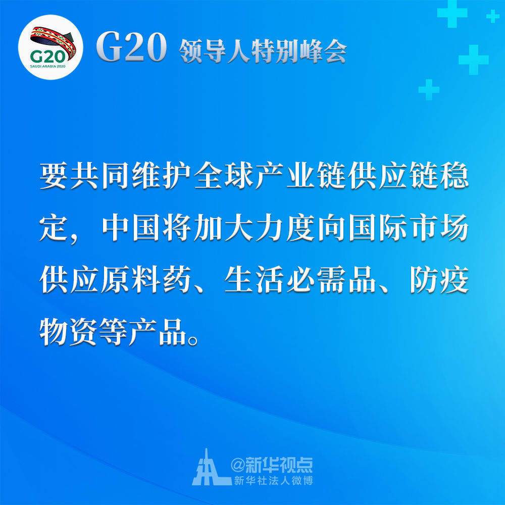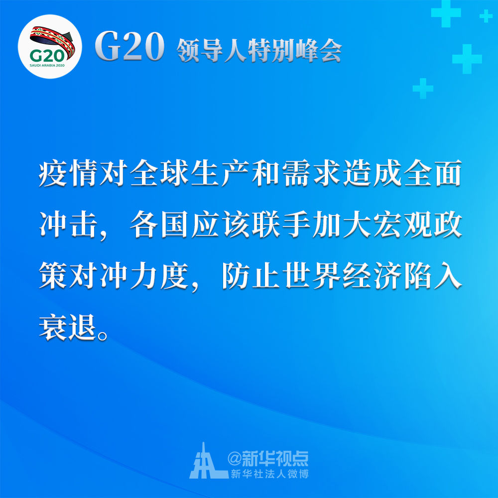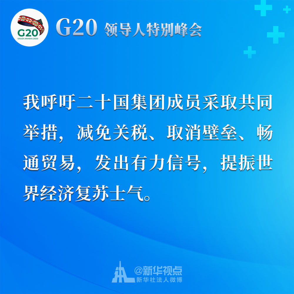 我呼吁二十國(guó)集團(tuán)成員采取共同舉措,減免關(guān)稅、取消壁壘、暢通貿(mào)易,發(fā)出有力信號(hào),提振世界經(jīng)濟(jì)復(fù)蘇士氣。我們應(yīng)該制定二十國(guó)集團(tuán)行動(dòng)計(jì)劃,并就抗疫宏觀政策協(xié)調(diào)及時(shí)作出必要的機(jī)制性溝通和安排。