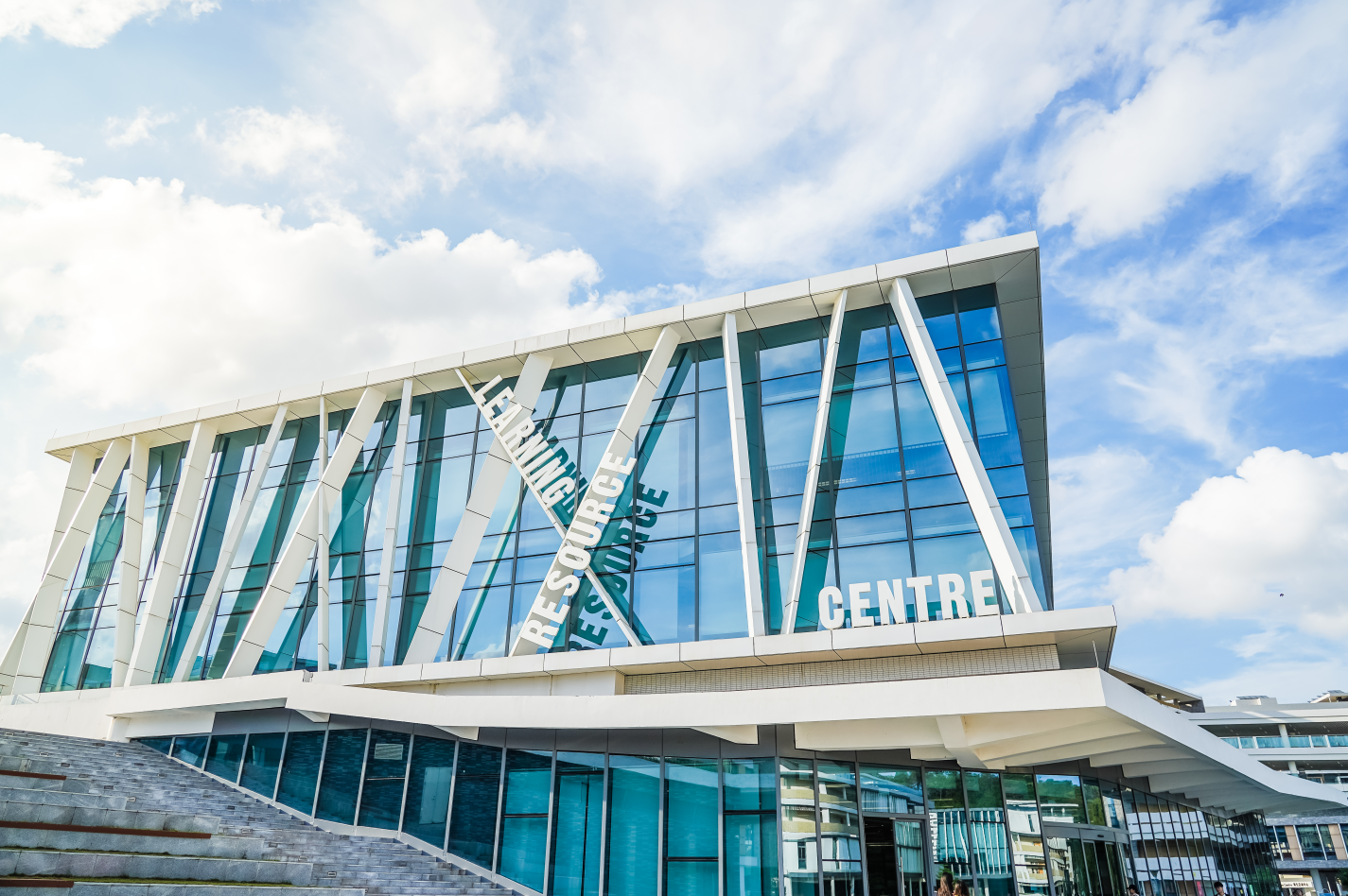 玻璃外觀的學習資源中心在陽光下熠熠生輝,螺旋式的樓梯,草綠色地毯不斷延伸,配置智能書架、圖書自動分揀機、圖書殺菌機、電子閱讀機等高科技設施……