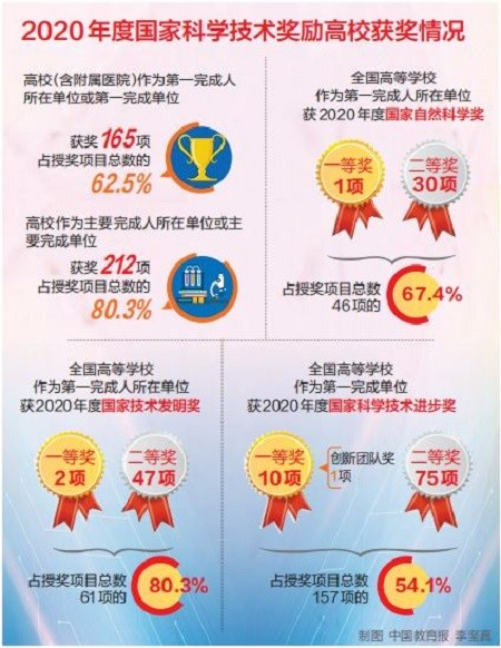 2020年度國家科學技術獎勵大會于11月3日在人民大會堂隆重舉行。高校(含附屬醫(yī)院)作為第一完成人所在單位或第一完成單位獲獎165項,占授獎項目總數的62.5%;作為主要完成人所在單位或主要完成單位獲獎212項,占授獎項目總數的80.3%。