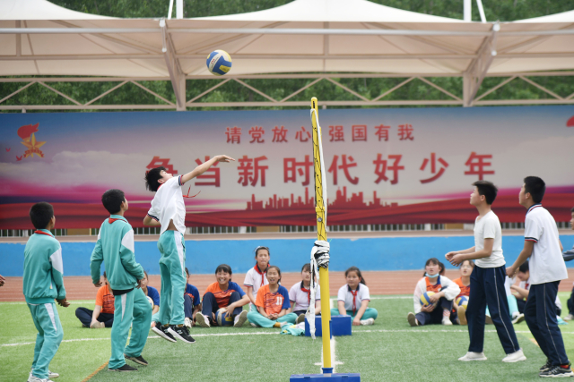 2022年4月25日,在山東省聊城市茌平區(qū)賈寨鎮(zhèn)耿店新村小學(xué),排球隊(duì)員們?cè)谶M(jìn)行排球訓(xùn)練賽 。趙玉國(guó) 攝