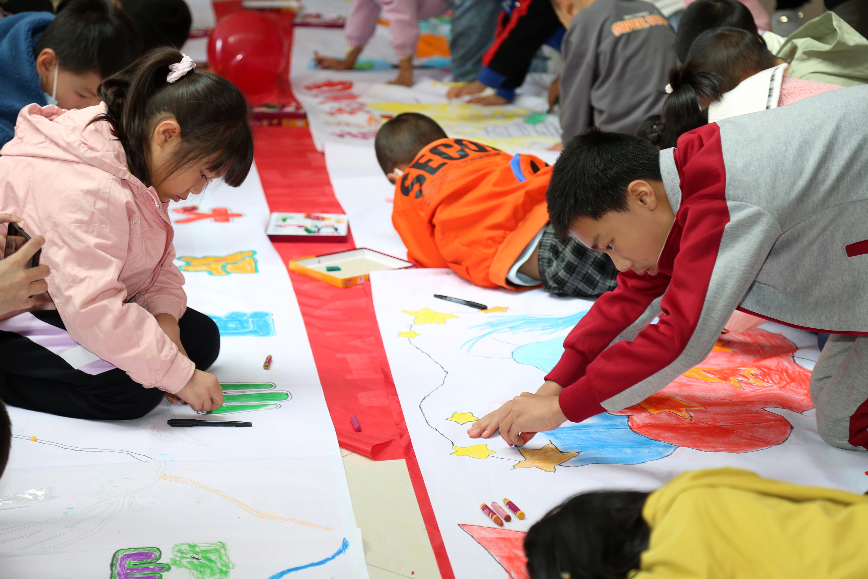 小朋友們或蹲坐或趴著,充分發(fā)揮想象力,用畫筆清晰地勾畫出鮮紅的五星紅旗、氣勢(shì)雄偉的天安門……用最誠(chéng)摯的童心和五彩的畫筆創(chuàng)作了美好家園的主題畫作。