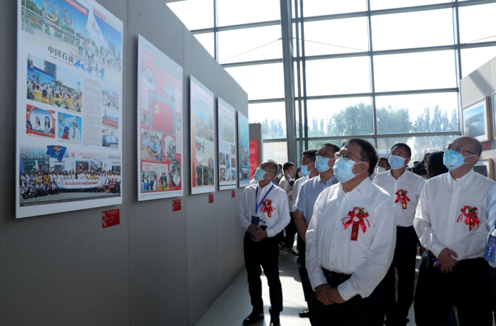 中國行業(yè)報協(xié)會會長張超文與60家行業(yè)媒體領導參觀圖片展。董芳忠 攝