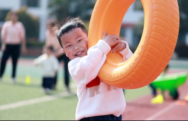 4月24日,萬(wàn)戶新村托育園托大班金霖寶寶在戶外活動(dòng)中抱著自己最喜歡的彩色輪胎。