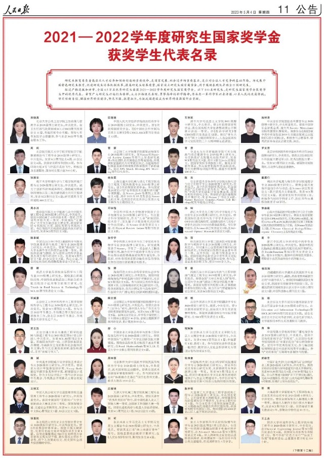 5月4日,《人民日?qǐng)?bào)》專版刊登《2021—2022學(xué)年度研究生國家獎(jiǎng)學(xué)金獲獎(jiǎng)學(xué)生代表名錄》,展示研究生國家獎(jiǎng)學(xué)金獲獎(jiǎng)學(xué)生中的100名優(yōu)秀代表的風(fēng)采。
