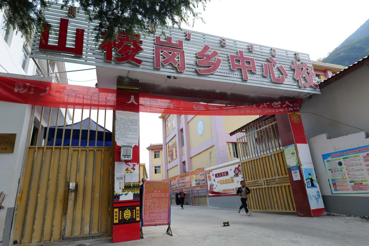 山棱崗鄉(xiāng)中心校大門。學(xué)校老師們使用手機(jī)應(yīng)用程序,記錄監(jiān)測學(xué)生到校情況,控輟保學(xué)