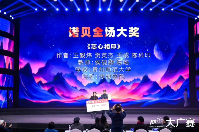 全場大獎是大廣賽最高獎項,經(jīng)過全國總評審的評委投票、評議,從10個作品類別中評選出4組備選作品。現(xiàn)場通過作品展示、闡述要點、評委點評、現(xiàn)場投票等環(huán)節(jié),最后由大廣賽資深評委投票決出全場大獎得主。經(jīng)過現(xiàn)場激烈角逐和尖峰對決,貴州師范大學(xué)傳媒學(xué)院的王毅煒、賀英杰、王成、陳科印同學(xué)以作品科大訊飛命題微電影作品《芯心相印》的超凡創(chuàng)意與優(yōu)秀舞臺表現(xiàn)力,贏得評委和現(xiàn)場觀眾的一致好評,最終獲得第16屆大廣賽全場大獎。