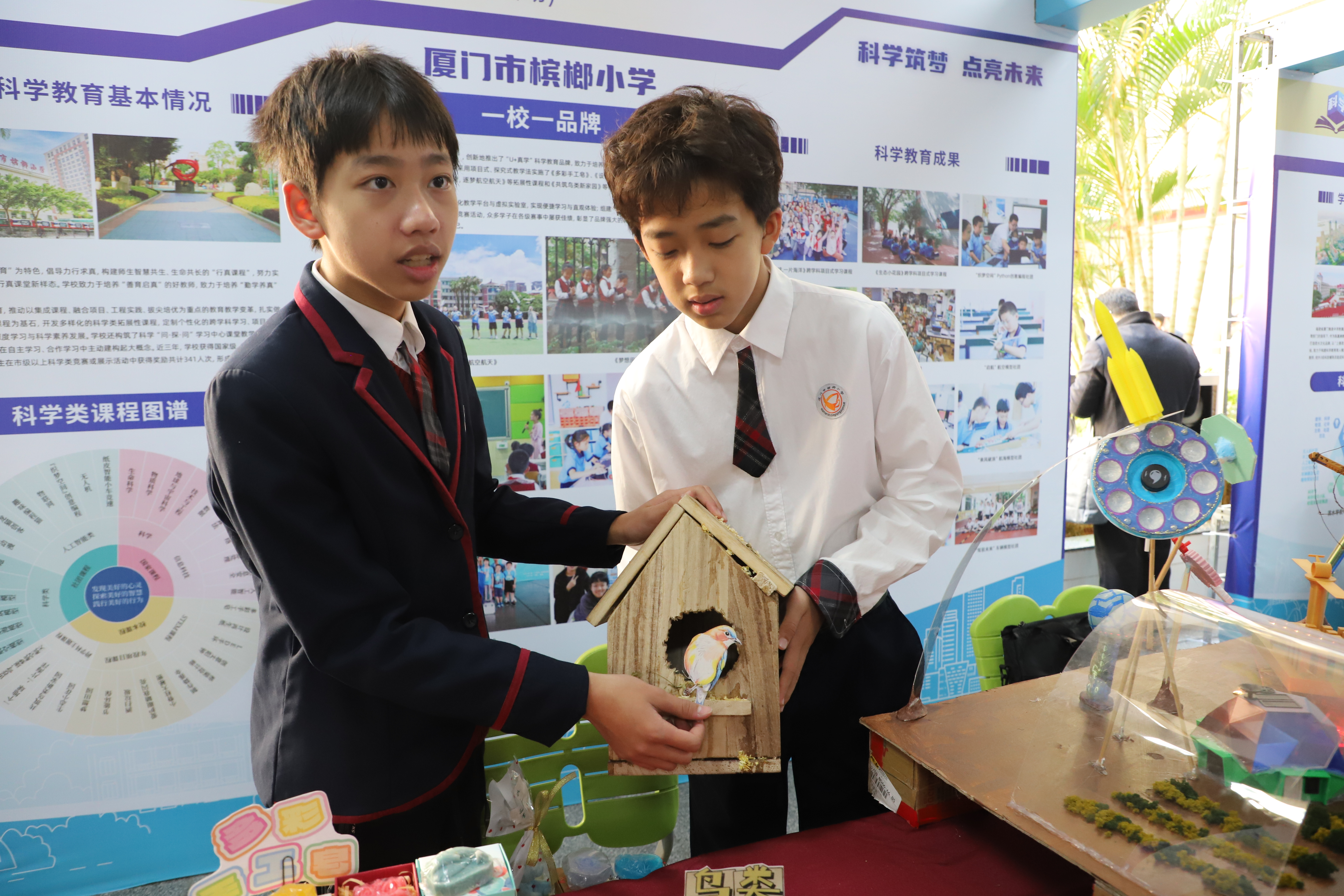 在雙十中學海滄附屬學校的展位上,教師和學生正在使用3D打印機、木工臺等工具制作各種工藝品;蓮前小學的師生則向大家展示了學校的自然科學課程——“花生成長記”;廈門市金林灣實驗學校的一名初一學生展示自己制作的兩只會跳舞的機器獅,這是他上完學校的人工智能課后完成的作品……本次系列活動主會場設在雙十中學海滄附屬學校,活動現場設置中小學科學教育成果展,來自廈門一中、廈門外國語學校、廈門金安小學等50所學校的師生展示了各自的成果。