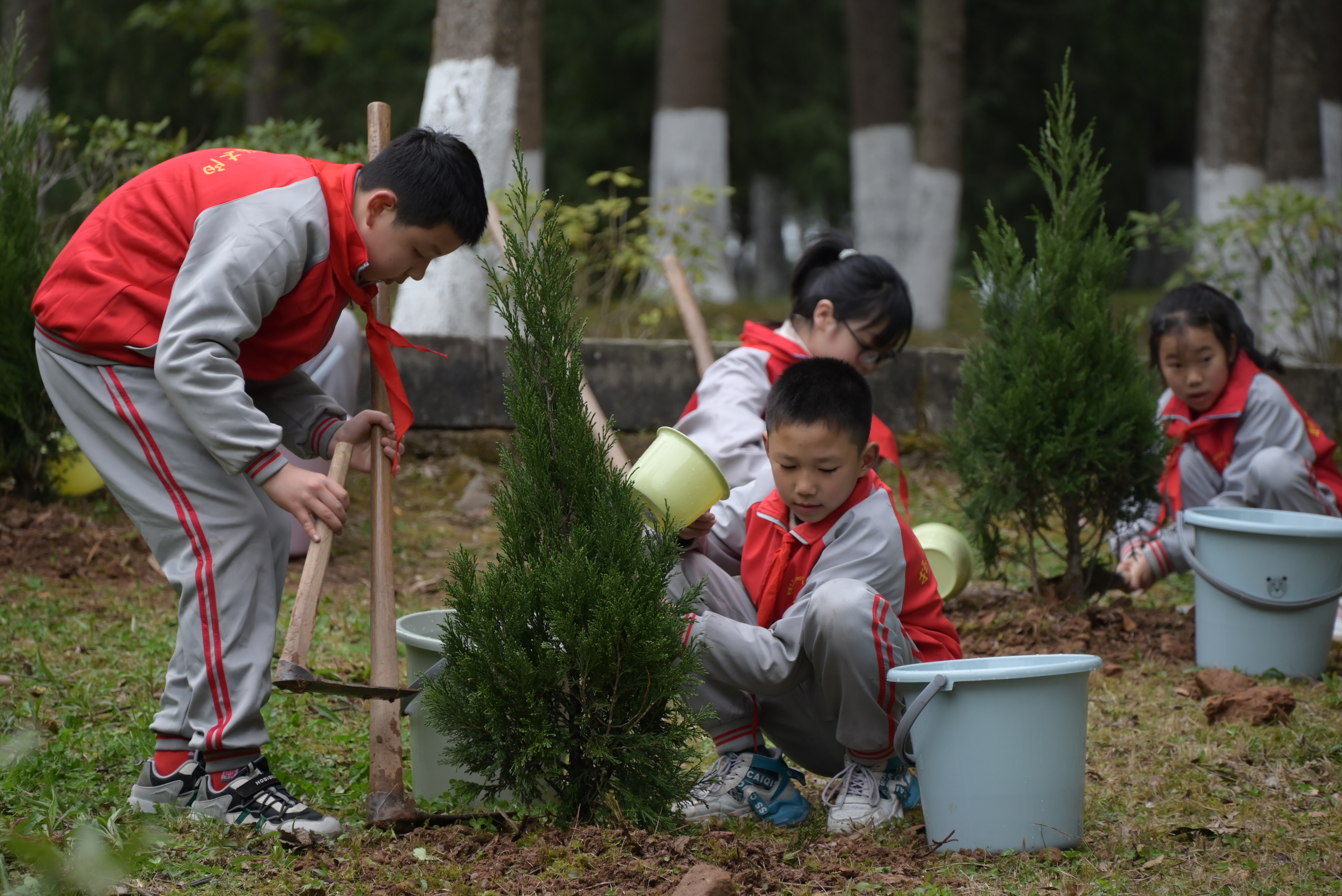 中國教育報-中國教育新聞網(wǎng)訊(通訊員 周福林 周樹江 記者 葛仁鑫)“土要壓實,水要澆透!”3月11日,植樹節(jié)前夕,在位于四川省巴中市通江縣的川陜革命根據(jù)地紅軍烈士陵園內,鐵鍬與土石的碰撞聲劃破薄霧,通江李先念紅軍小學五年級學生林君昊扶正一株柏樹苗,胸前的紅領巾與烈士墓碑上的紅星交相輝映。在他身后,還有44名學生和他一樣,用稚嫩的雙手將樹苗栽入土中。