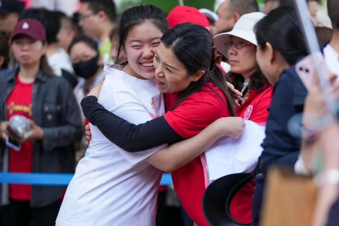 6月7日,在哈爾濱市第九中學(xué)考點(diǎn),考生走入考場(chǎng)前與老師擁抱。新華社記者 王建威 攝