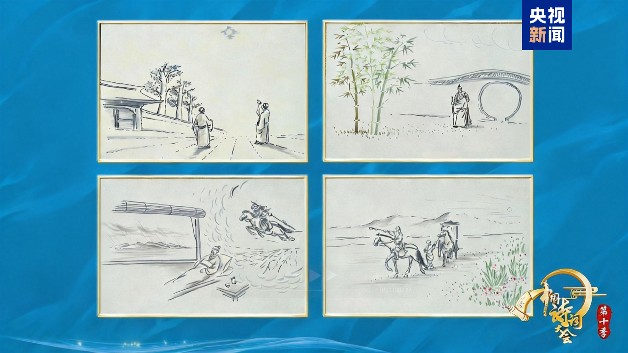 “畫中有詩”環(huán)節(jié)中,康震老師現(xiàn)場作畫,以筆墨激活詩句。每一幅畫中,都藏著一句等你喚醒的詩。讓我們來一起猜猜看吧!