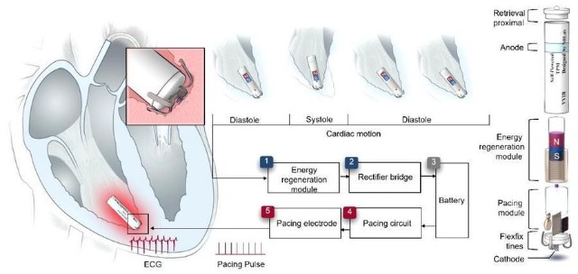 這款起搏器的核心創(chuàng)新是集成了高效能量再生模塊:它能通過電磁感應(yīng)技術(shù),從心臟自身的跳動中捕獲動能,并將其轉(zhuǎn)化為電能。測試顯示,其輸出功率已突破起搏器終身運行的臨界能量閾值,可穩(wěn)定驅(qū)動起搏電路,實現(xiàn)對心臟節(jié)律的精準調(diào)控。同時,器件采用高度微型化設(shè)計,兼具優(yōu)異的生物相容性與血液相容性,支持經(jīng)導(dǎo)管微創(chuàng)植入,大幅降低手術(shù)創(chuàng)傷。
