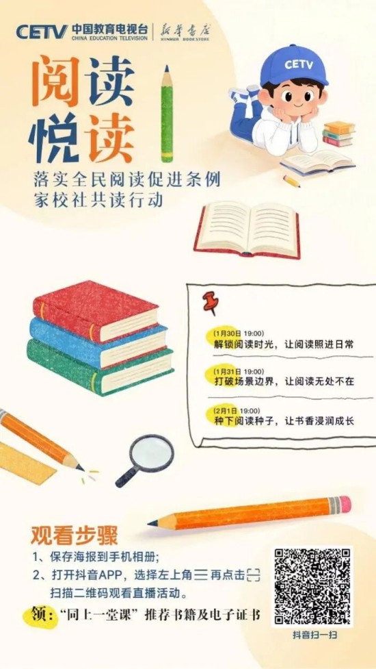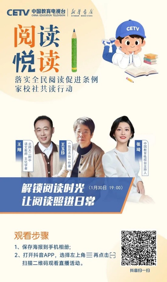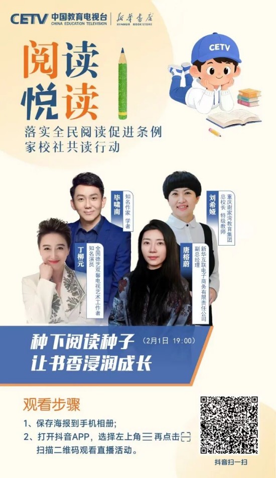 為推動(dòng)條例有效落地、培養(yǎng)廣大青少年更好地閱讀,在教育部基礎(chǔ)教育司指導(dǎo)下,中國(guó)教育電視臺(tái)聯(lián)合人民教育出版社、新華書(shū)店總店,特邀閱讀推廣人、閱讀領(lǐng)誦人、閱讀分享人等,共同開(kāi)啟“落實(shí)全民閱讀促進(jìn)條例 家校社共讀行動(dòng)”全媒體直播活動(dòng)。這不僅是對(duì)條例精神的踐行,更是對(duì)“讀書(shū)破萬(wàn)卷,下筆如有神”的文化傳承,是為青少年搭建與先賢對(duì)話、與自我對(duì)話、與世界對(duì)話的精神橋梁。