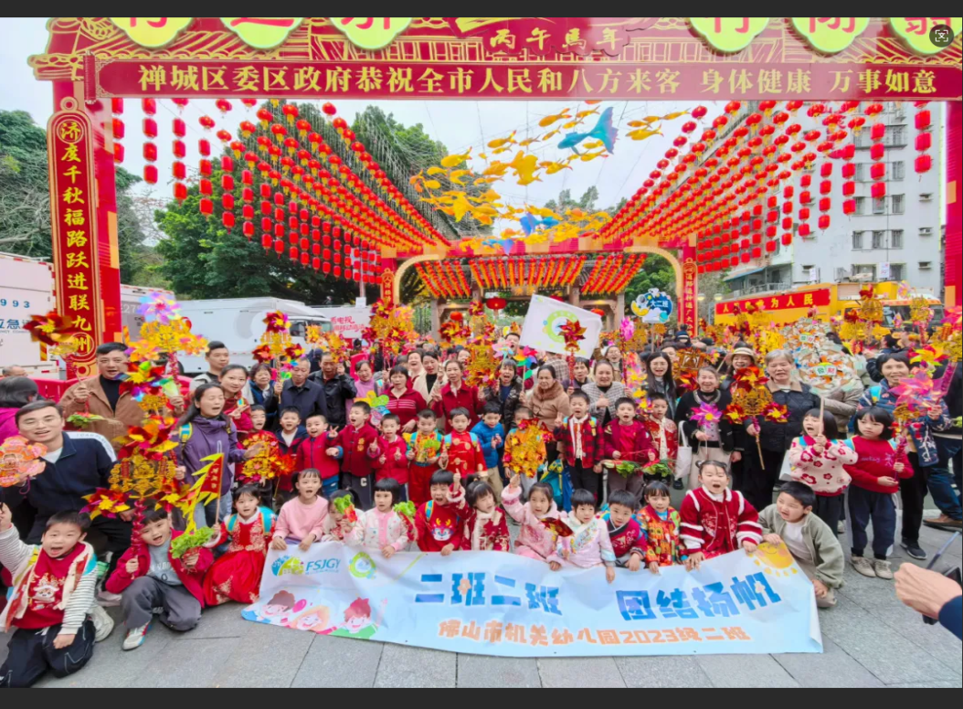 不止機(jī)關(guān)幼兒園,禪城多所學(xué)校、幼兒園紛紛以元宵節(jié)為契機(jī),將民俗體驗(yàn)與“一校一品”特色深度融合,讓校園成為傳統(tǒng)文化傳承的主陣地。佛山市第九小學(xué)的同學(xué)們手持風(fēng)車,邁著整齊的步伐走過通濟(jì)橋,將少年意氣與民俗韻味相融;佛山市第十中學(xué)的師生們提著親手制作的魚燈,有序行進(jìn)在人流中,魚燈搖曳間,盡顯嶺南燈彩的雅致;萬科中心城怡樂幼兒園的孩子們?cè)谕?jì)橋前合影留念,定格下民俗與童真的美好瞬間。