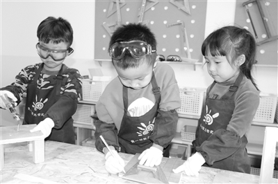 包頭鐵路第一幼兒園的木工坊,是大班孩子社會(huì)活動(dòng)的區(qū)域。在保證安全的情況下,教師支持孩子按自己的想法完成工木作品,鼓勵(lì)并給予一定的指導(dǎo)。孩子們?cè)诓僮鬟^程中,不斷發(fā)現(xiàn)并解決問題,在完成作品的同時(shí)提高了專注力、學(xué)習(xí)力和思考能力。王霞 攝