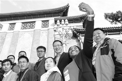 11月24日,一位來自納米比亞共和國的教育官員(右二)在會(huì)議代表合影時(shí)自拍。當(dāng)日,由中國教育科學(xué)研究院主辦的第二屆“一帶一路”教育對(duì)話在京召開,近40個(gè)“一帶一路”沿線國家和部分國際組織的教育官員、專家學(xué)者出席。 本報(bào)記者 鮑效農(nóng) 攝