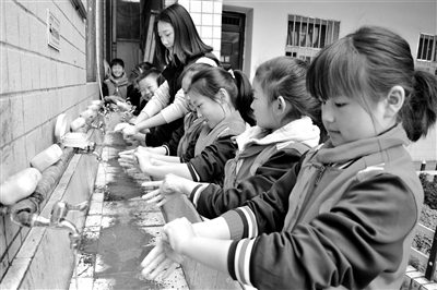 4月4日,湖北省十堰市鄖陽區(qū)柳陂鎮(zhèn)中心小學(xué)三年級學(xué)生正在“比賽”洗手。該校600多名小學(xué)生通過上“洗手”衛(wèi)生知識教育課方式,迎接“世界衛(wèi)生日”的到來。楊顯有 胡萍 攝