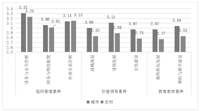 農(nóng)村園長(zhǎng)對(duì)專(zhuān)業(yè)素養(yǎng)的自我評(píng)價(jià)普遍低于城市園長(zhǎng)。除了在組織管理素養(yǎng)、財(cái)務(wù)與物資配置以及外部關(guān)系管理素養(yǎng)外,農(nóng)村園長(zhǎng)在其他維度上均顯著低于城市園長(zhǎng)。
