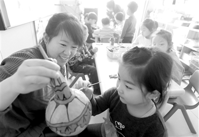 河北省張家口市宣化區(qū)趙川幼兒園從2016年開(kāi)始進(jìn)行課程改革,經(jīng)過(guò)三年多的探索、研究,改變了以“教師為中心”的慣性思維和注重知識(shí)傳授的傾向,如今自主游戲已經(jīng)成為該園的基本活動(dòng)形式。圖為教師在配合孩子完成葫蘆繪畫作品。宋強(qiáng) 張學(xué)軍 攝