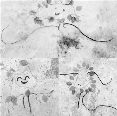 孩子們在大樹下?lián)鞓渲Γ趯挸ǖ乃嗟厣蠑[出了一個個“跳舞的人”,樹葉裝點(diǎn)成五官,小人變得飽滿、形象、有精神。