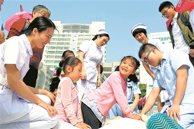5月12日是母親節(jié)也是國際護士節(jié)。5月11日,在湖南省衡陽市南華大學(xué)廣場,一名小朋友在模擬心肺復(fù)蘇操作時,得到大家的贊揚,她自豪地說:“我媽媽就是護士!”當日,南華大學(xué)邀請幼兒園和中小學(xué)師生走進校園,進行健康急救知識的宣傳與普及。單勝男 曹正平 攝