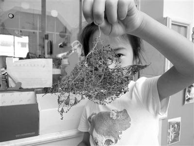 詩琪和靖文每天來得最早,她們第一件事就是給蠶寶寶清理糞便、換桑葉。這活做起來并不容易,因?yàn)樾Q太小,且密集地黏附在桑葉上。她們試著把蠶抖落到另一干凈盒子里的新鮮桑葉上,可總有些黏得太牢而抖不下來,她們又試著用嘴巴吹,還是不行。最后,詩琪找來長條形海綿紙片,用紙片把黏附在上面的蠶小心翼翼地?fù)芘聛怼?/P>