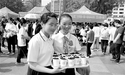 日前,浙江省杭州市淳安縣千島湖初級(jí)中學(xué)組織七、八兩個(gè)年級(jí)1500多名學(xué)生舉行愛(ài)心義賣暨紅十字博愛(ài)周活動(dòng)。義賣活動(dòng)籌集2.9萬(wàn)余元善款,全部捐給了該縣紅十字會(huì)設(shè)立的淳安縣千島湖初級(jí)中學(xué)“博愛(ài)·至善”資金專項(xiàng)賬戶。這筆善款將專門用于該校尿毒癥、血友病、腦癌等患病學(xué)生的救助。此項(xiàng)義賣已經(jīng)連續(xù)舉辦了11年,籌集近30萬(wàn)元善款,共有16萬(wàn)名學(xué)生參與。圖為兩名女生在吆喝叫賣桑果。