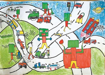 下午離園前,秋實(shí)把他的“未來(lái)世界”畫(huà)出來(lái)了,并高興地向大家介紹起來(lái):“我夢(mèng)想的未來(lái)世界可漂亮了,有很厲害的機(jī)器人,可以幫助警察叔叔指揮交通,還可以開(kāi)車(chē)帶我們出去玩。未來(lái)世界的汽車(chē)不但可以在地上跑,還可以飛起來(lái)?!?/P>
