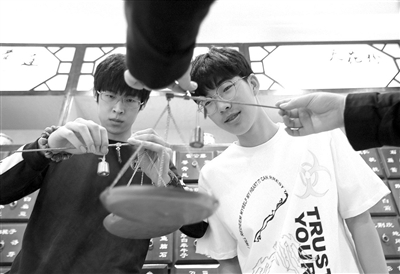 圖為神農(nóng)標(biāo)本館內(nèi)中藥學(xué)專(zhuān)業(yè)學(xué)生在體驗(yàn)神奇國(guó)粹。