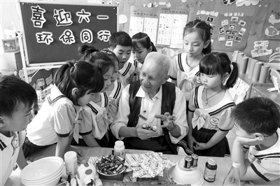 5月27日,環(huán)保老人朱天榮在給幼兒園小朋友講解垃圾分類知識。當日,擁有浙江省“綠色公益使者”稱號的朱天榮,來到湖州市德清縣中心幼兒園,參加該園開展的“”活動,講解環(huán)保常識,并通過環(huán)保游戲鼓勵小朋友爭當環(huán)保小衛(wèi)士。斯艷 攝
