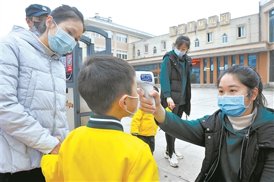 日前,江西省德興市幼兒園舉行了開學(xué)前疫情安全防控應(yīng)急演練,通過入園測溫、間隔進(jìn)園、安全消毒等場景模擬,規(guī)范應(yīng)急事件的報(bào)告和處置流程,為師幼身心健康和生命安全筑牢第一道防線,為順利復(fù)學(xué)做好充分準(zhǔn)備。圖為教師對進(jìn)園幼兒進(jìn)行體溫測試防疫演練。