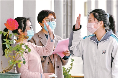 3月30日清晨,6點(diǎn)剛過,內(nèi)蒙古呼和浩特市第二中學(xué)門口,高三學(xué)生們已經(jīng)按錯(cuò)峰、錯(cuò)時(shí)、錯(cuò)樓層的要求,自覺排隊(duì)在校門口測(cè)量體溫,而后分散進(jìn)入教室。