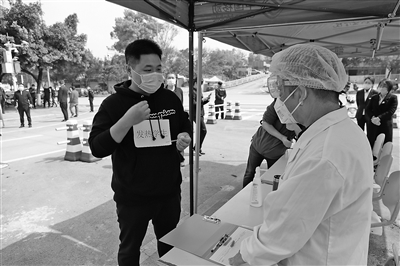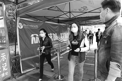 應(yīng)急演練主要模擬學(xué)生在入校報到和在學(xué)生宿舍出現(xiàn)發(fā)熱等癥狀時,學(xué)校的防控應(yīng)急處理流程,主要涉及學(xué)生異常狀況發(fā)現(xiàn)、轉(zhuǎn)運、隔離、報告、消殺和師生錯時就餐6個場景。在入校演練環(huán)節(jié),由帶班領(lǐng)導(dǎo)、學(xué)管部門人員、醫(yī)護人員、安保人員組成的入校檢測隊伍提前上崗,組織“學(xué)生”在校門口分成四隊前后保持1.5米以上距離(佩戴口罩)有序排隊,進入體溫檢測通道,接受檢測組的體溫檢測,在出示校園卡及“渝康碼”后有序入校。體溫異常者,在校門外“臨時觀察區(qū)”等候醫(yī)護人員復(fù)測,體溫仍然高于37.3℃的,詢問現(xiàn)病史及流行病學(xué)史,上報校防控辦,由值班輔導(dǎo)員陪同,乘坐學(xué)校指定車輛至陳家橋醫(yī)院發(fā)熱門診就診。