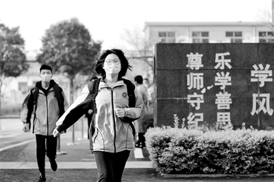 4月15日,山東省棗莊市第一中學(xué)高三學(xué)生魏蘭婷(右一)第一個(gè)跑入久違的校園。當(dāng)日,山東省內(nèi)高中(含中職)學(xué)校畢業(yè)年級(jí)學(xué)生開學(xué)復(fù)課。孫晉之 攝