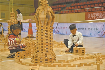 還是得從教育的專(zhuān)業(yè)視角去分析!幼兒園隨即啟動(dòng)木玩小課題研究,每位教師必須參與。例如,在大班的卡普樂(lè)建構(gòu)游戲中,起初孩子們只會(huì)在地面上簡(jiǎn)單地平鋪,興趣持續(xù)時(shí)間不長(zhǎng)。徐艷玲組織課題組成員研究后發(fā)現(xiàn),由于卡普樂(lè)的形狀單一,易導(dǎo)致孩子們不知如何建構(gòu)作品。于是,老師們提出了通過(guò)優(yōu)化環(huán)境、現(xiàn)場(chǎng)模仿建構(gòu)、設(shè)置挑戰(zhàn)等方式來(lái)激發(fā)孩子們的建構(gòu)興趣??墒且欢螘r(shí)間后,孩子們建構(gòu)高樓的熱情又逐漸退去,課題組再次研討并提出了新的策略。“現(xiàn)在到我們班,你可以看到北京天壇、萬(wàn)里長(zhǎng)城、云和板龍等一系列作品,孩子們的建構(gòu)思維被打開(kāi)了?!毙炱G玲對(duì)記者說(shuō)。