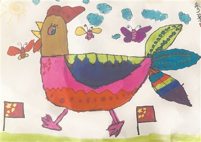 在大公雞的周圍,我還畫了幾只漂亮的小蝴蝶。有了小蝴蝶的陪伴,它的心情一定美美的。