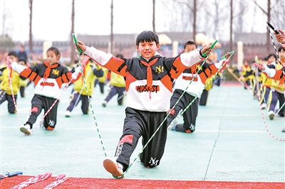 如果說(shuō),以上探索都帶有對(duì)鄉(xiāng)土文化的傳承,那么睢寧縣安慶鎮(zhèn)百年老校騎路小學(xué)的花樣跳繩特色課程建設(shè),則可以看作一種糾正現(xiàn)代不良生活方式的嘗試。在該校,全體師生齊跳大繩,共編花樣。學(xué)?,F(xiàn)在有花樣跳法300多個(gè),開(kāi)設(shè)了繩韻系列課程,有趣味繩畫(huà)等12個(gè)社團(tuán)??棟O網(wǎng)、做手工……學(xué)生體育健康各項(xiàng)指標(biāo)均優(yōu)于其他學(xué)校,基本沒(méi)有了近視,“小胖墩兒”也很罕見(jiàn)。