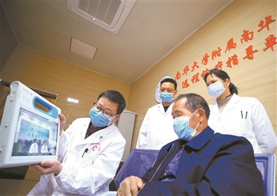 當(dāng)吳勝軒和鄒海貴走進(jìn)遠(yuǎn)程診療室時(shí),大屏幕已投射出南華大學(xué)附屬南華醫(yī)院負(fù)責(zé)會(huì)診的專(zhuān)家畫(huà)面?!袄先思?,您哪些地方不舒服,慢慢和我們說(shuō)?!边h(yuǎn)在200多公里外的醫(yī)生緩慢而又大聲地對(duì)著屏幕說(shuō)道。通過(guò)在線(xiàn)問(wèn)診、查閱病歷和檢查結(jié)果,短短20分鐘后,醫(yī)生完成遠(yuǎn)程診療并制訂出治療方案。