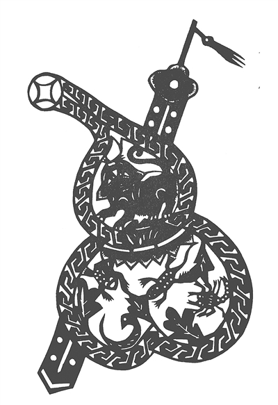 用于民間避邪除毒習(xí)俗的葫蘆圖像,一般是由葫蘆與“五毒”形象組成,如“吸毒葫蘆”“倒災(zāi)葫蘆”“消災(zāi)葫蘆”“葫蘆鎮(zhèn)五毒”等。“五毒”或飾于葫蘆內(nèi),或圍繞在葫蘆外,有“吸五毒”“鎮(zhèn)五毒”“除五毒”的作用,另配老虎、雄雞、利劍、剪刀等形象,象征消災(zāi)避邪。山東蓬萊的“葫蘆除五毒”剪紙?jiān)诤J內(nèi)剪出五毒和猛虎,再插一把利劍,老虎、利劍出手必滅五毒。山西祁縣有“雞食五毒葫蘆”剪紙,表示收毒功能?!暗篂?zāi)葫蘆”是小頭朝下,周圍飾有五毒形象,表示將五毒之氣泄盡之意。北方還有“五色吉祥葫蘆”剪紙,端午節(jié)貼于家門上,據(jù)說可以吸納五毒等邪惡之氣,到初五晚上把它撕下丟棄,認(rèn)為可平安吉祥。在民間,葫蘆圖像用于民俗生活,成為祈福納吉、辟邪禳災(zāi)的重要藝術(shù)形式。